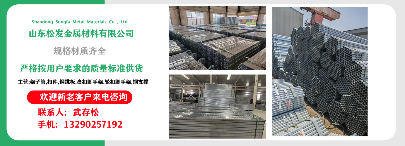 山東松發金屬材料有限公司主營架子管,扣件,鋼跳板,盤扣腳手架,輪扣腳手架,鋼支撐生產廠家。本廠專業生產銷售。 建筑用架子管、 主要用于房建,橋梁,鐵路,公路,地鐵,水庫,隧道,支撐。 架子管,扣件,鋼跳板,盤扣腳手架,輪扣腳手架,鋼支撐的優越性及應用“ ”產品因具有結構簡單合理、設計巧妙、使用方便、安全、快捷、易于運輸、儲存、維護簡單等特點?! 」疽回瀳猿帧百|量,用戶至上,優質服務,信守合同”的宗旨,憑借著高質量的產品,良好的信譽,優質的服務,產品暢銷全球。歡迎廣大客戶來電洽談,共同發展,共創輝煌! 山東松發金屬材料有限公司秉承誠信服務、恪守信譽的宗旨,在同等的質量下,保證以最低的價格,最完善的服務,最高的信譽來答謝各界朋友的支持和厚愛,歡迎您的來電、咨詢,我們將竭誠為您服務!...
